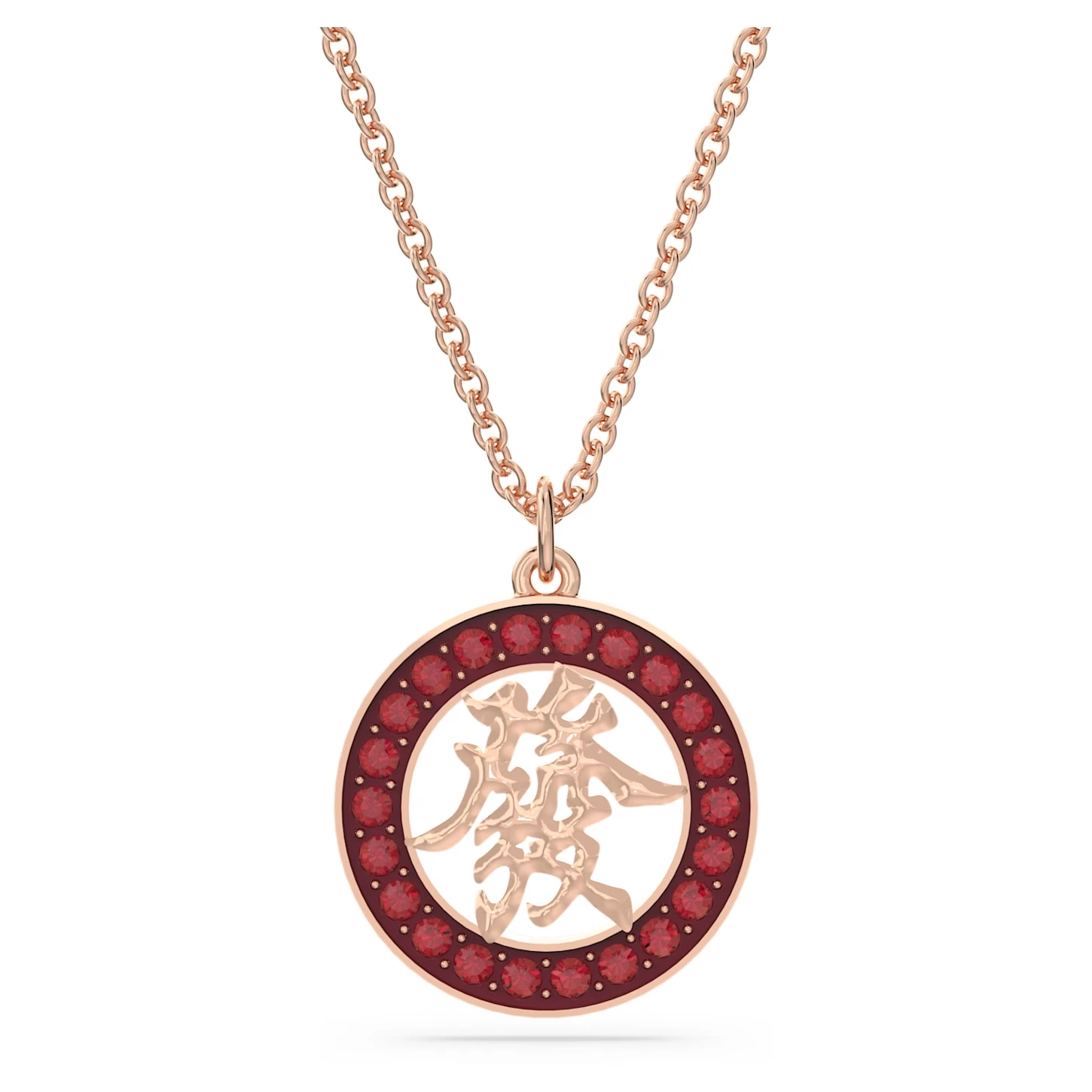This captivating piece is a beautiful way to celebrate Chinese New Year. The warm rose gold-tone plated design is brought to life with a perfect circle of round red crystals around a central motif symbolizing prosperity and wealth. Wear this pendant as a meaningful way to start the Year of the Rabbit or give it as a special gift.
