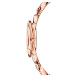 This Swarovski watch displays a brilliant integration of natural forms and modern design. Inspired by flowers, the bezel features two intertwined lines of shimmering rose-gold tone PVD coating, one adorned with glittering crystals. Nestled among these sparkling lines sits a silver-tone sunray dial adorned with crystal index markers and the Swarovski logo at 12 o’clock. The gently flowing lines of the rose-gold tone PVD coated bracelet continue the floral appeal of the bezel and add a delicate touch to this Swiss Made watch. Dress up your style with this floral timepiece to add extraordinary romance to your every day.