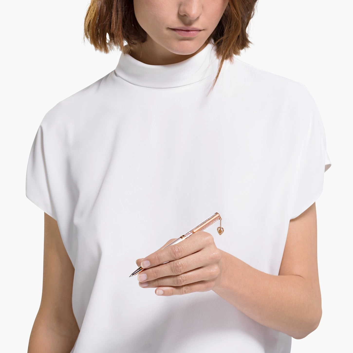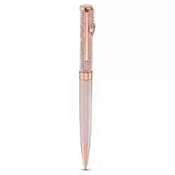 This refillable ballpoint pen by Swarovski features a powerful and romantic design. The color scheme of rose-colored lacquered metal and rose-gold tone plating lends it an air of elegance. Numerous Swarovski crystals fill the pen, making it sparkle brilliantly. A small, heart-shaped charm showing the word ‘LOVE’ is surrounded by beautiful crystals. The perfect romantic gift for a special someone.