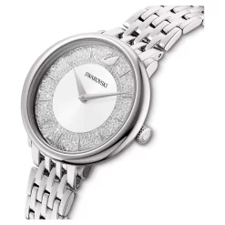 The design for this watch by Swarovski is inspired by the serene beauty and purity of raindrops. This imagery is emphasized by the flowing shape of the stainless steel case, which is filled with approximately 1,000 sparkling crystals. The silver-tone sunray dial and the sparkles create a unique contrasting brilliance. Meanwhile, a shimmering bracelet secures the watch to the wrist, making it an elegant addition to your everyday outfits.