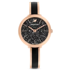 Effortlessly chic, this easy-to-wear Swarovski bangle watch is infused with iconic Crystalline sparkle. Its modern dial and elegant rose-gold tone PVD coated stainless steel case, filled with approximately 1,000 black crystals, shimmers with fresh brilliance. The jewelry-inspired bangle, also crafted in rose-gold tone PVD coated stainless steel, is finished with a minimalist design in lustrous black enamel. A perfect accessory to style this season and beyond, the watch is made in Switzerland and water resistant to 50m. Adjustable links ensure it will fit any wrist size. Swiss Made.