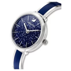 Effortlessly chic, this easy-to-wear Swarovski bangle watch is infused with iconic Crystalline sparkle. Its modern dial and elegant stainless steel case, filled with approximately 1,000 blue crystals, shimmers with fresh brilliance. The jewelry-inspired bangle, also crafted in stainless steel, is finished with a minimalist design in lustrous blue enamel. A perfect accessory to style this season and beyond, the watch is made in Switzerland and water resistant to 50m. Adjustable links ensure it will fit any wrist size. Swiss Made.