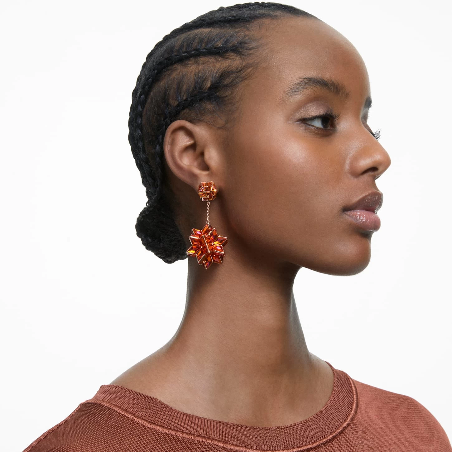 Make a bold entrance at your next event with these exquisite pierced earrings. Combining two intricate ‘mathemagical’ structures crafted from triangle cut crystals, this pair features a striking sphere and starburst design joined by a sleek rose gold-tone plated bar. Wear them with your favorite LBD and expect to turn heads. These earrings are part of the Curiosa Family, designed for Collection III.