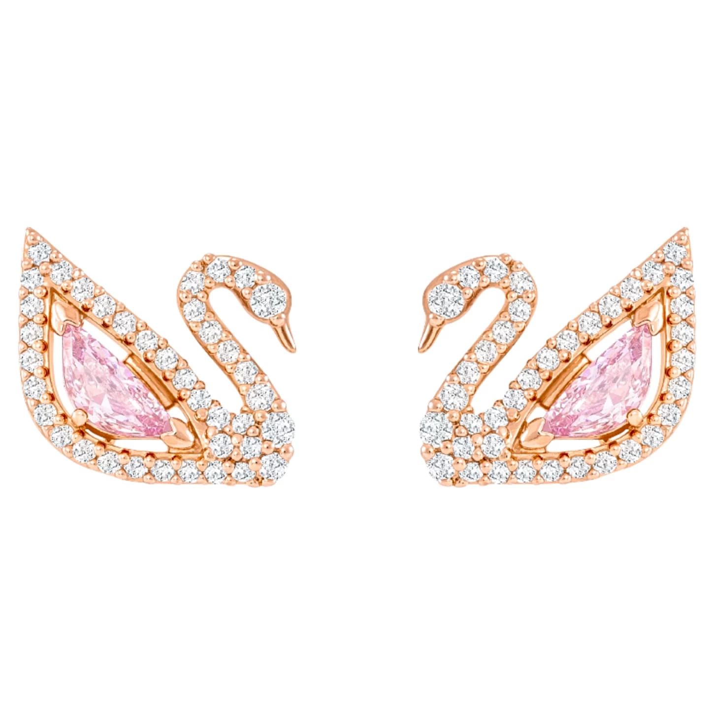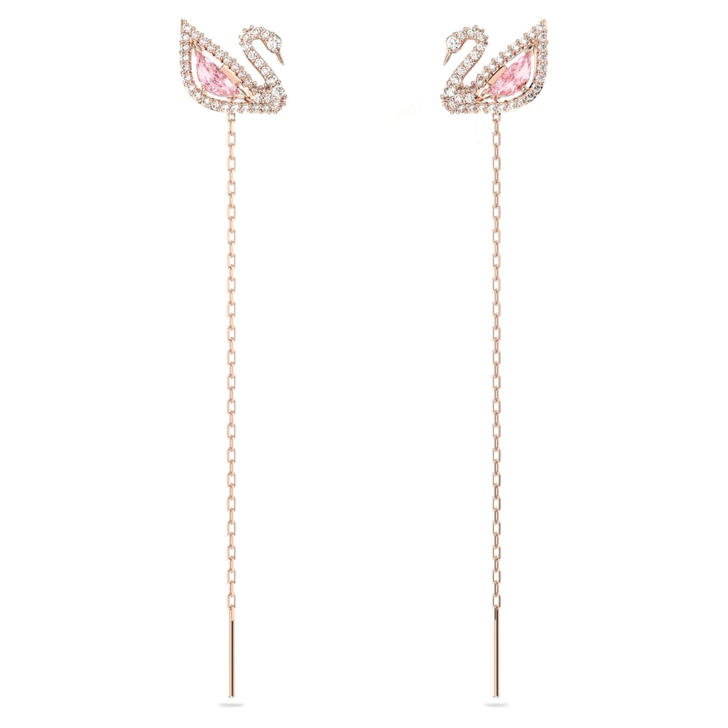Enjoy multiple looks with this dazzling pair of versatile long-length pierced earrings. The iconic swan motif shines with a full-cut crystal body in cool millennial pink and crisp clear pavé lines. Wear as simple studs, or attach one, or both, of the delicate rose gold-plated chains for more statement style. A dainty design that will undoubtedly add cool and romantic style to your everyday collection. Matching items are available.