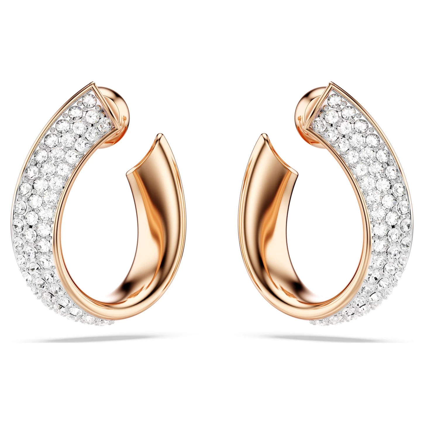 Designed with a unique front-to-back silhouette, these hoop earrings feature a ribbon design that wraps around the earlobe to showcase rose gold-tone plating on one side and clear crystal pavé on the other. Exuding a subtle sophistication, they are a versatile choice.