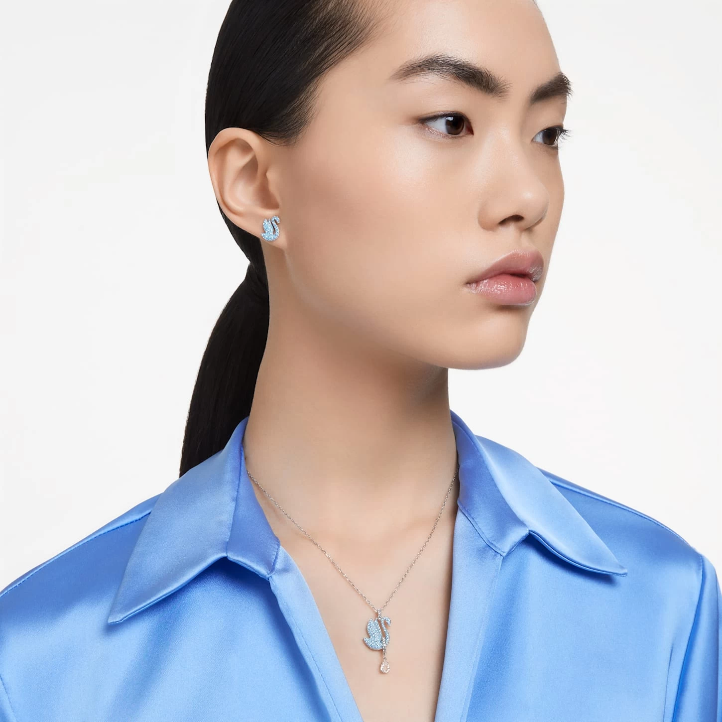 This graceful Iconic Swan set is the perfect combination to ignite your style. Including pierced stud earrings and a long pendant, each radiant piece features an all-over pavé of ice blue crystals. A single pear-shaped stone hangs beneath the pendant for added luxury. This set is an ideal gift for a loved one who adores vivid color in their style.