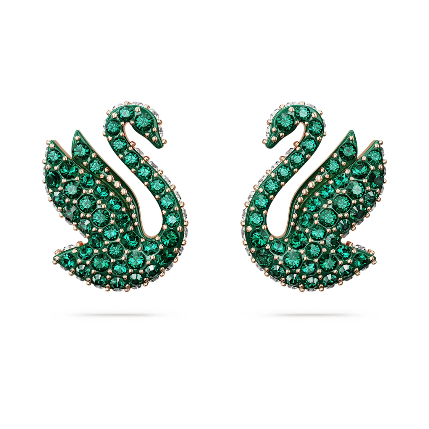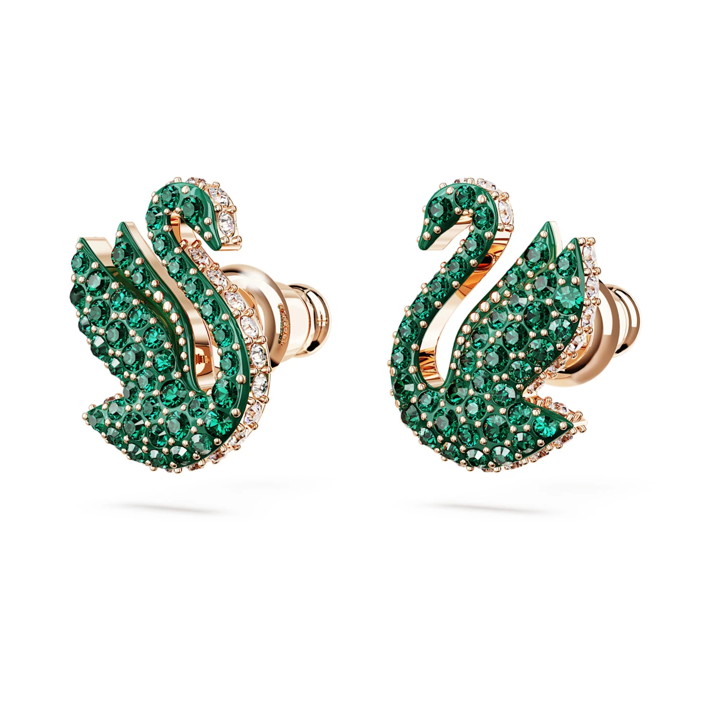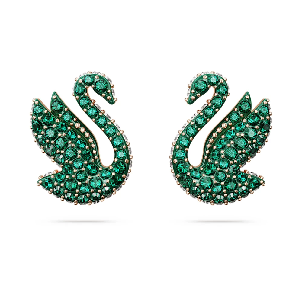 Swarovski Iconic Swan Stud Earrings Swan, Green, Rose Gold-tone Plated