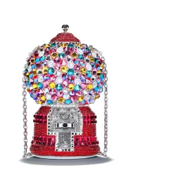 Tempting enough to turn heads, the classic red gumball machine gets crystallized in full-spectrum color. Hand-applied crystals form an illusion of juicy gumballs all set in a clutch bag form. Complete with a top push down closure and removable long shoulder chain, this standout piece by Judith Leiber is styled seamlessly with a casual jeans-and-t-shirt silhouette and an elevated evening look alike. Translating the coolest pop-culture shapes into wearable icons, Judith Leiber brings red-carpet staple bags to the Swarovski Creators Lab.