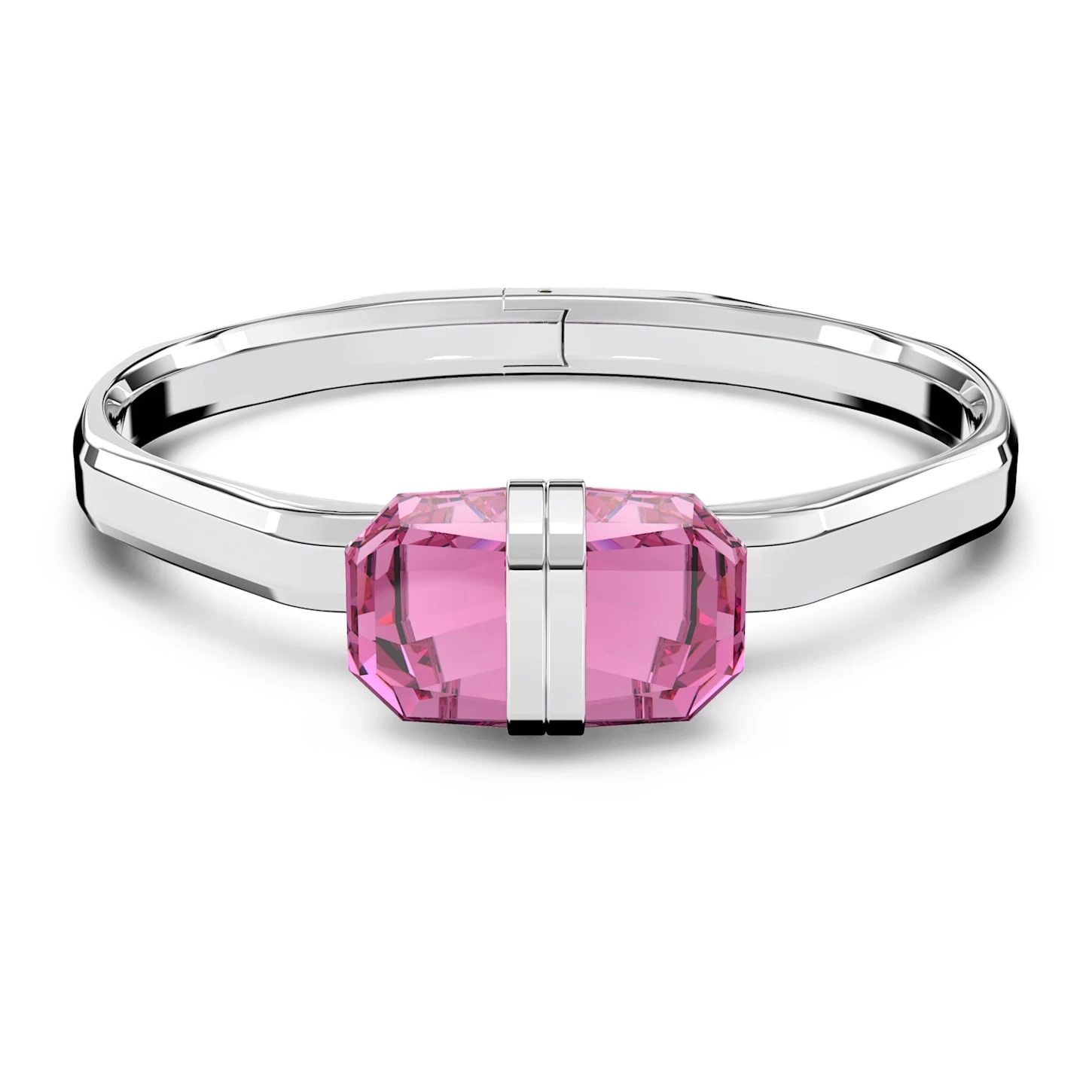 Dress up a simple outfit with this elegant, octagon-shaped bangle. Designed with a full crystal cut in a playful pink hue, this geometric-inspired piece features a stainless steel setting and an innovative magnetic closure. Wear yours with everything from denim to tailoring. This bangle is part of the Lucent Family, designed for Collection III. How to close and open it: to close, place one magnet on top of the other and slot together. To open, locate the small indent on the side of the magnetic closure and pop it open.