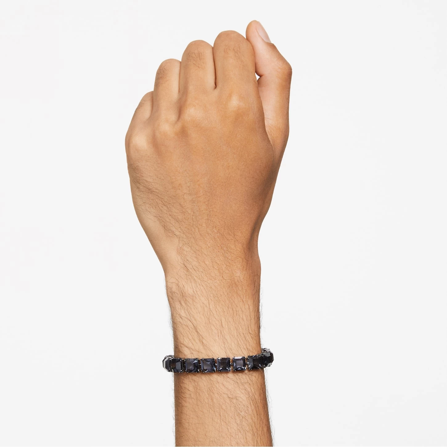 This striking bracelet defines everyday elegance with an edge. Featuring square-cut crystals in a bold, graphite hue, it’s expertly finished with a sleek, rhodium-plated setting. Intended to be genderless, wear yours solo as the ultimate punctuation for any look – or stack it with other designs from the Millenia family. This bracelet is part of the Millenia family, designed by Creative Director Giovanna Engelbert for Collection II. How to close and open it: slide the hooks into the corresponding holes at the base of the end stone and push to click into place. To open, unfasten the security chain and press the buttons on either side of the stone at the same time to release the hooks.