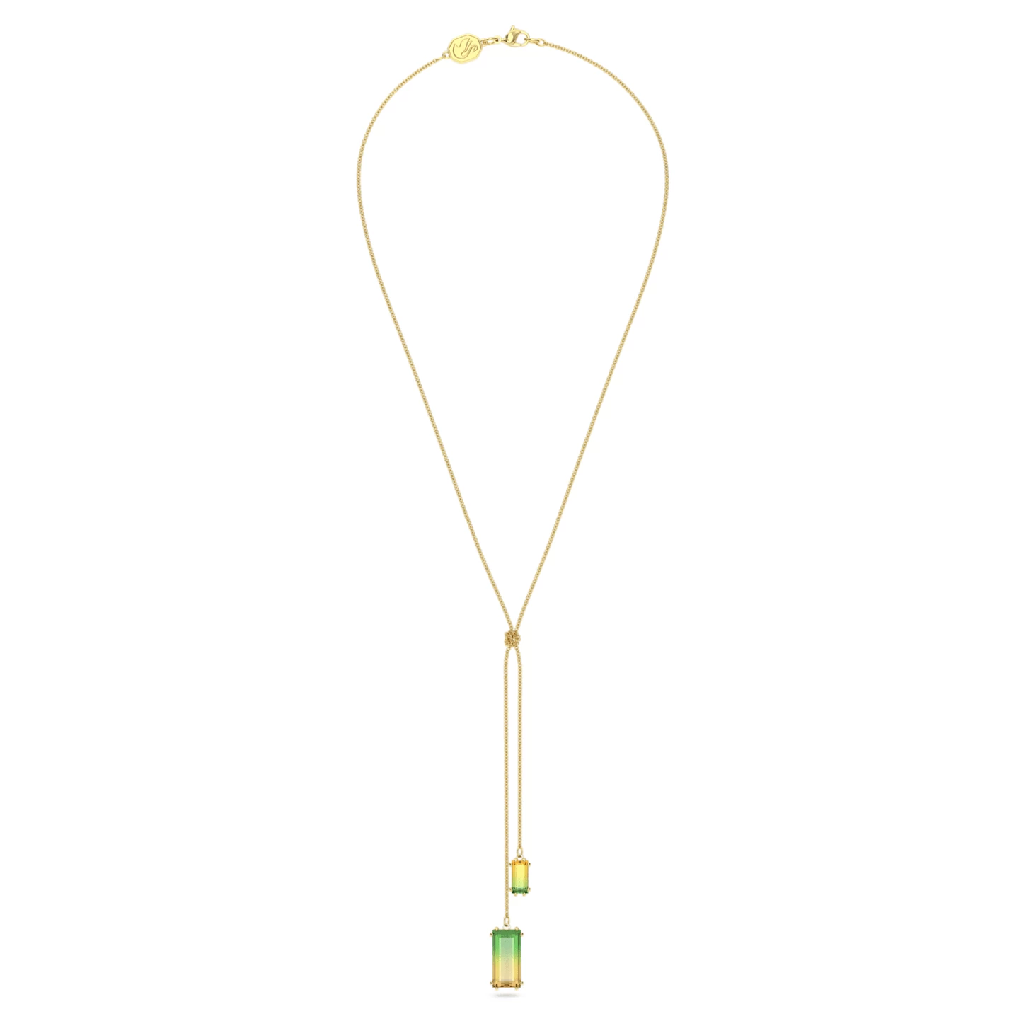 Bold yet timeless, this pendant features two striking crystals suspended from a gold-tone plated chain. The vibrant green and yellow hues add a playful spin to an otherwise refined piece. Wear yours solo or styled with other designs from the Millenia family for maximum impact – day or night. This pendant is part of the Millenia Family, designed for Collection III.