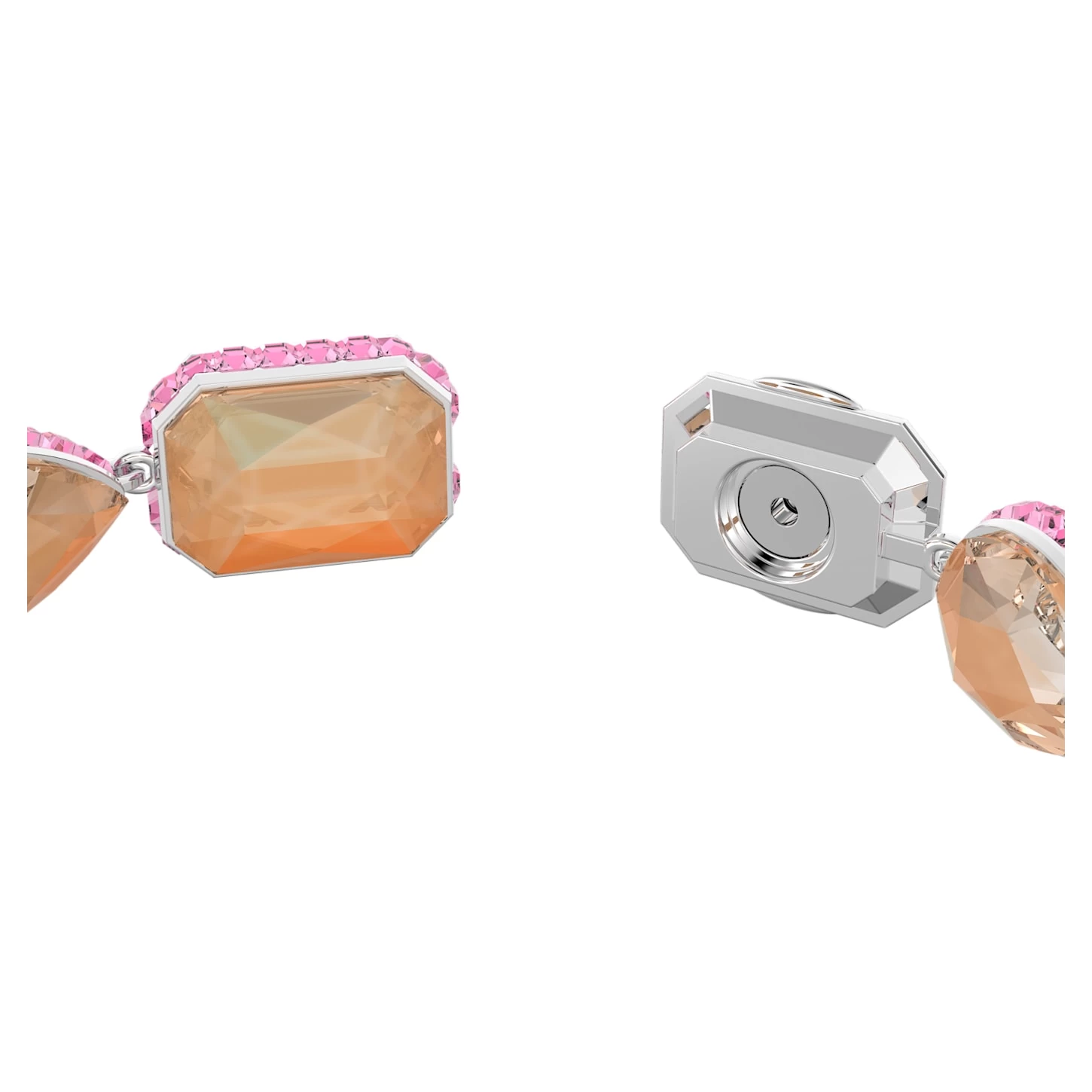 This beautiful bracelet will lend a striking pop of color to your everyday wardrobe. Featuring a row of octagon and pear cut crystals framed with smaller pink baguette cut crystals, its innovative reversible design means you can choose between green or orange as the focal hue. Finished on a rhodium plated setting with invisible closures, style this elegant piece with the matching necklace for a uniquely chic statement. This bracelet is part of the Orbita family, designed by Creative Director Giovanna Engelbert for Collection III. How to close and open it: to close, place one magnet on top of the other and slot together. To open, locate the small indent on the side of the magnetic closure and pop it open.