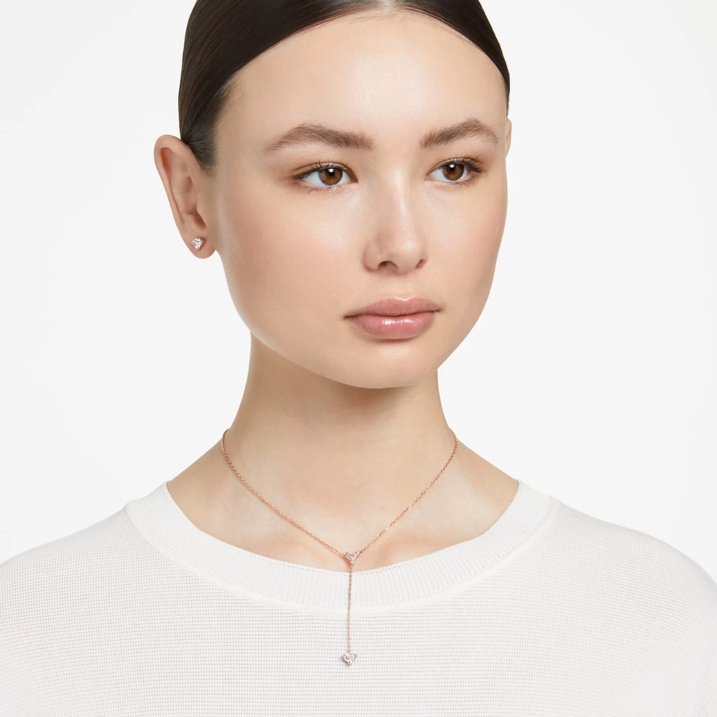 Express your individuality with this playful, punk-inspired set from the Ortyx family. It includes a Y-shaped necklace and stud earrings, which feature hand-set triangle-cut stones surrounded by shimmering pavé. Striking the balance of edgy and refined, it’s finished with rose gold-tone plating. Wear them and know which direction you are headed.