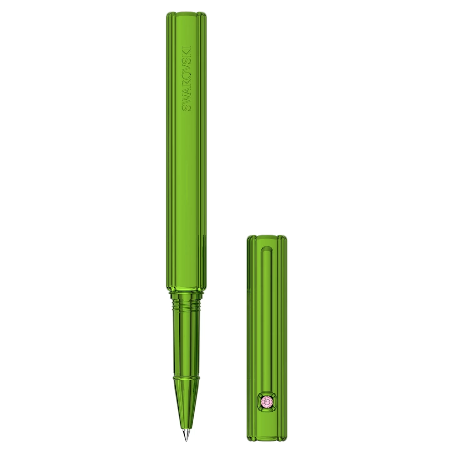 Inspired by the Dulcis family, this playful pen will add boldness and creativity to your writing experience. Designed with Rollerball technology, it features green chaton and fancy stones set against tonal metal plating. It is finished with a debossed Swarovski wordmark and removable cap.