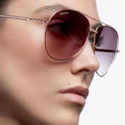 These pilot, gradient-tint sunglasses feature a smoky-gray finish to the lenses and fine, rose-gold tone frames adorned with delicate, greige crystals. Finished with transparent, gray temple tips, these sunglasses are an eyewear classic; whether worn for days at the beach, or strolling the city as the sun goes down at dusk, they’re sure to become your new wardrobe essential.