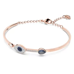 This stunning mixed-plated bangle offers a striking contrast between rose gold-plated metal, crystal pavé, and blue crystals. Featuring two eye motifs and a blue crystal drop, it has an adjustable closure for a secure fit. Mix and match with other bangles for a trendy look.