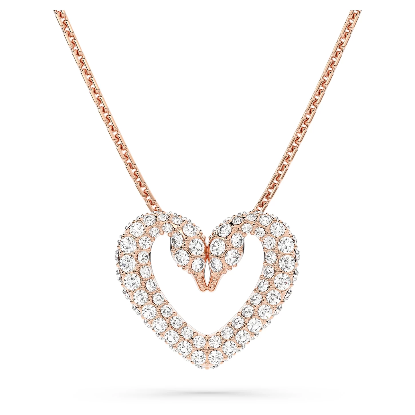 Embodying the beauty of nature with its double swan design, this delicate, heart-shaped pendant symbolizes the power of eternal love – and a new beginning for the Swarovski swan emblem. It features refined pavé crystals set against a rose gold-tone plated chain. A timeless and radiant choice for your everyday wardrobe. This pendant is part of the Una Family, designed for Collection III.